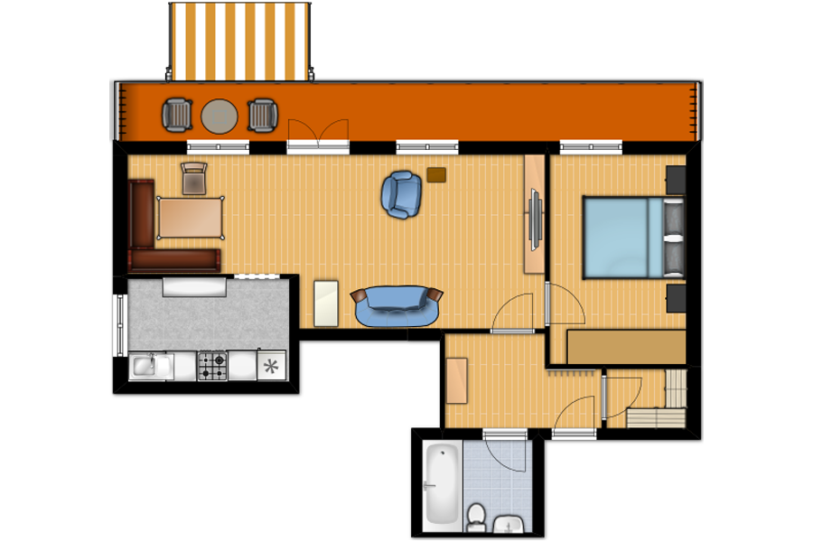- Separater Raum mit einer voll ausgestatteten, modernen Küche (Herd mit Ceranfeld und Backofen, Mikrowelle, Kaffeemaschine u.v.m.)